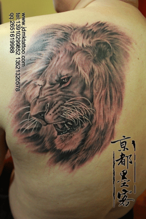 京都墨客纹身作品 男士后背狮子黑白纹身