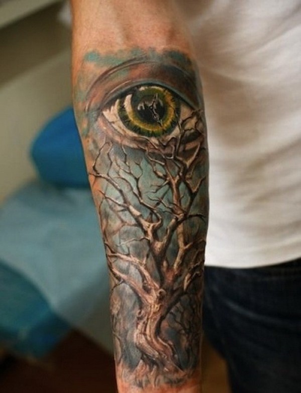 手臂奇妙的彩色树与眼睛和蓝色背景纹身图案