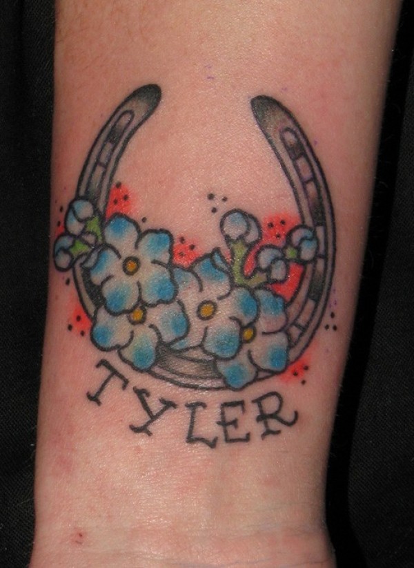 马蹄铁与蓝色花朵纹身图案