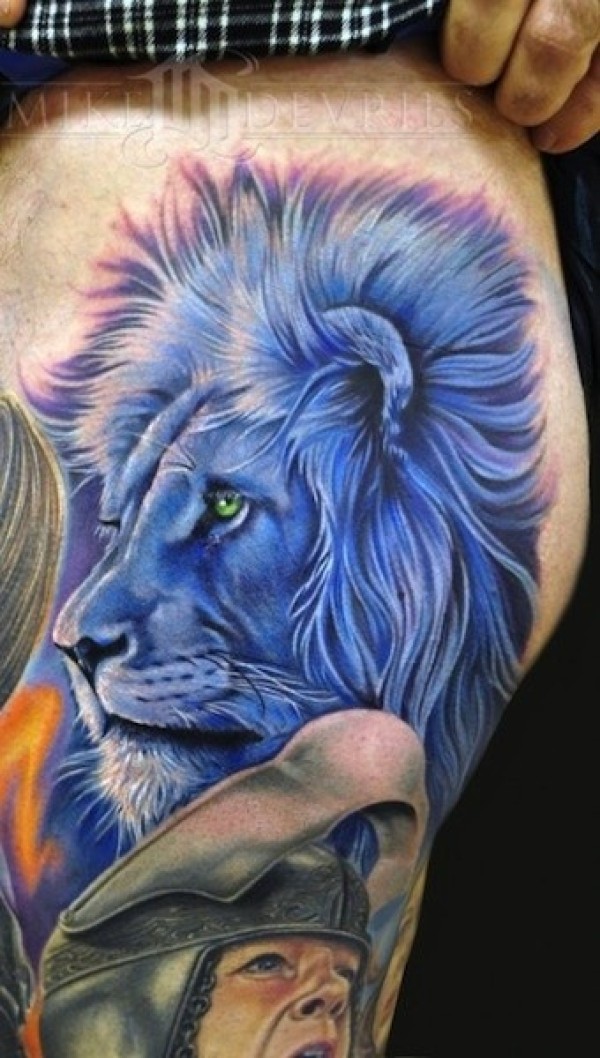 生动的蓝色狮子头纹身图案