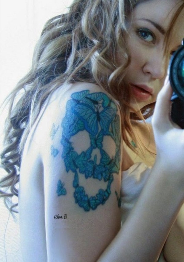 可爱的蓝色蝴蝶骷髅大臂纹身图案