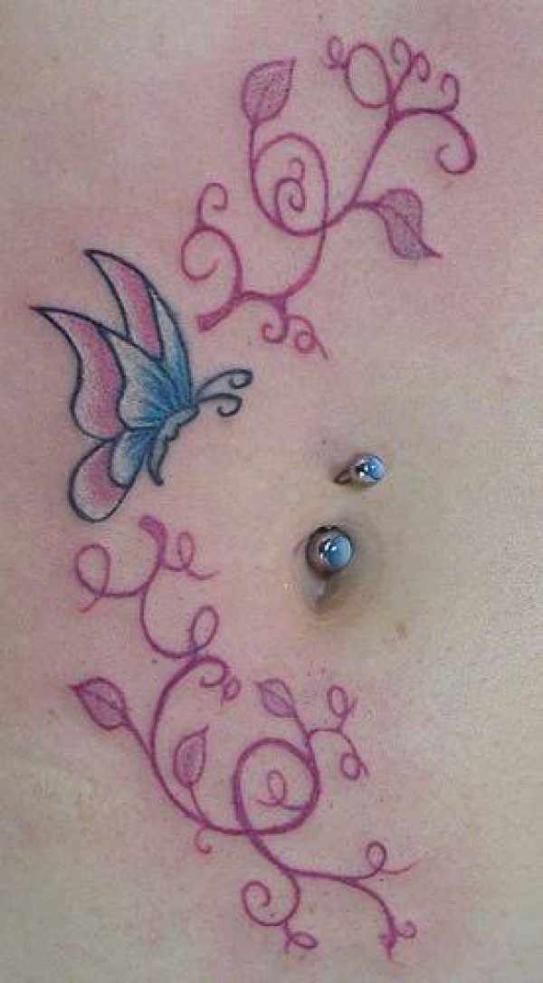 浅粉色藤蔓和蓝蝴蝶纹身图案
