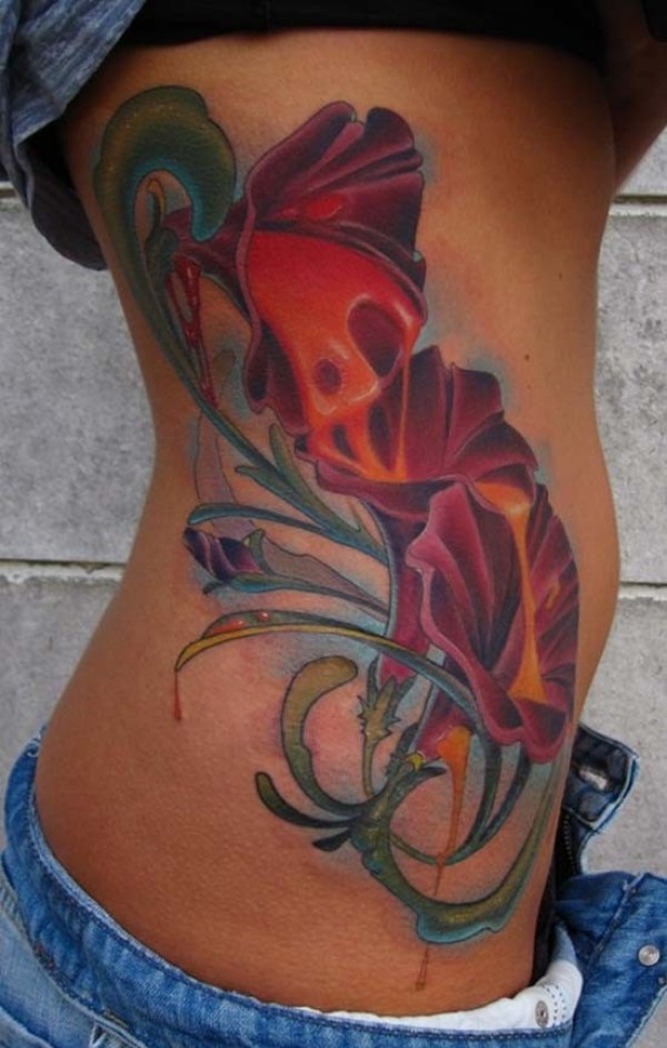 红色的牵牛花侧肋纹身图案