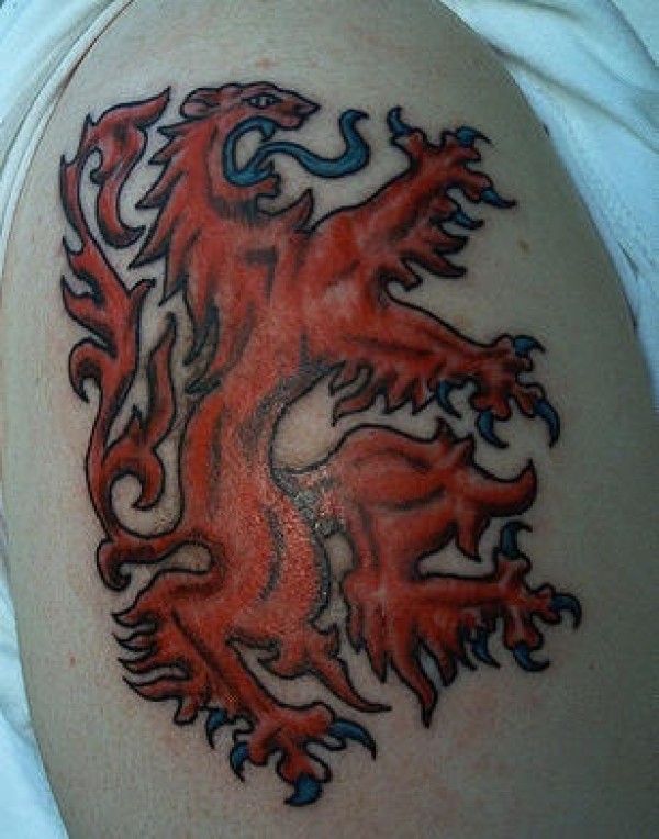 大臂红色怪物狮子与蓝色的舌头纹身图案