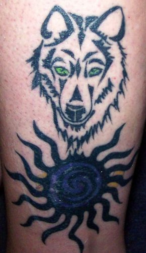 绿眼睛的狼和深蓝色的太阳纹身图案