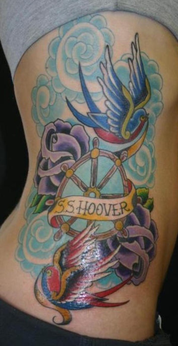 侧肋燕子和蓝色的云花卉字母纹身图案