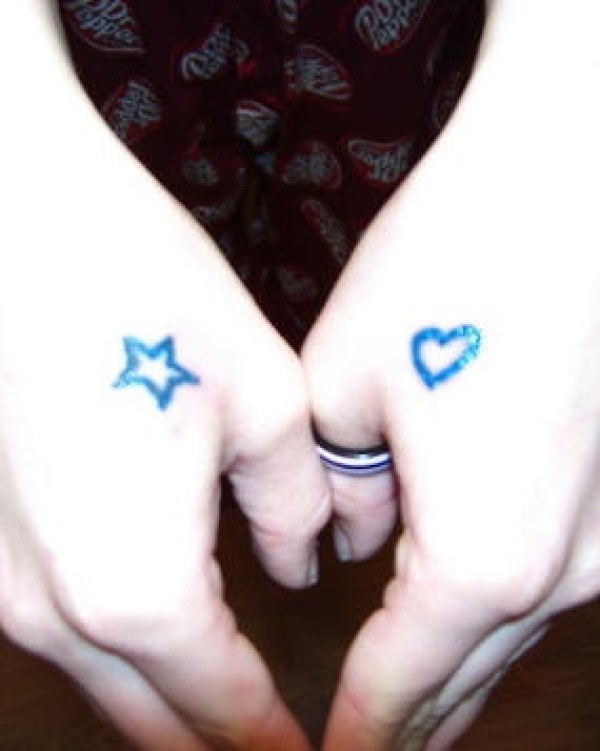 手背蓝色星星和心形纹身图案