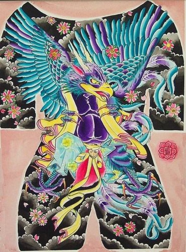 日式全甲蓝色飞兽纹身图案