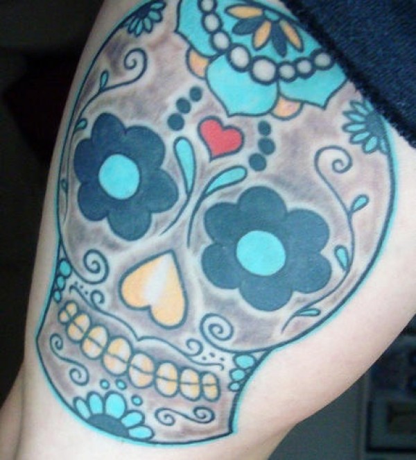 大腿蓝色墨西哥风格骷髅纹身图案