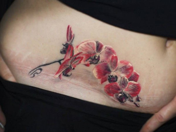 腹部迷人的传统浅红色兰花纹身图案