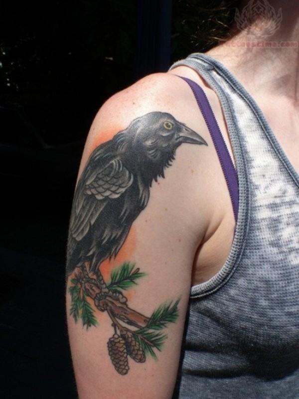 大臂old school彩色乌鸦坐在杉木枝纹身图案
