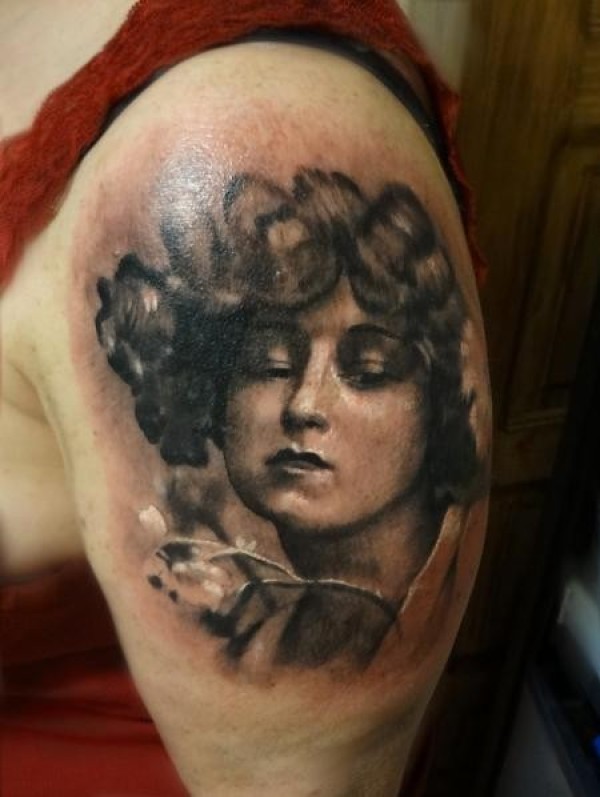 大臂彩色妇女肖像与花枝纹身图案