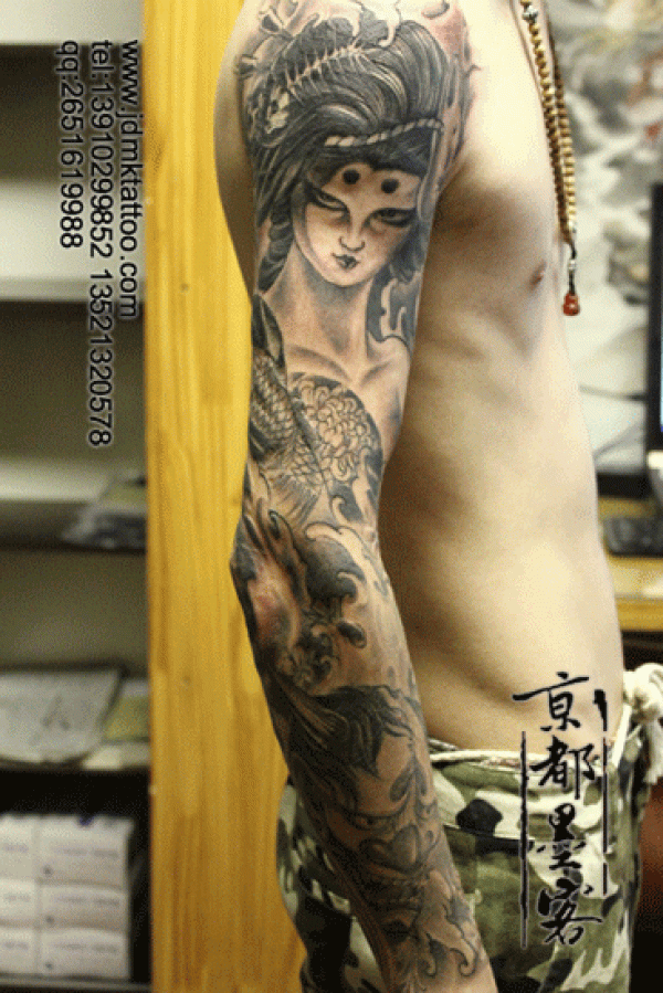 京都墨客纹身作品 包整臂般若艺妓黑白纹身