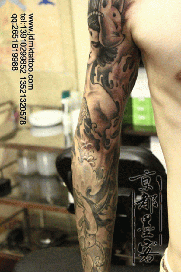 京都墨客纹身作品 包整臂般若艺妓黑白纹身