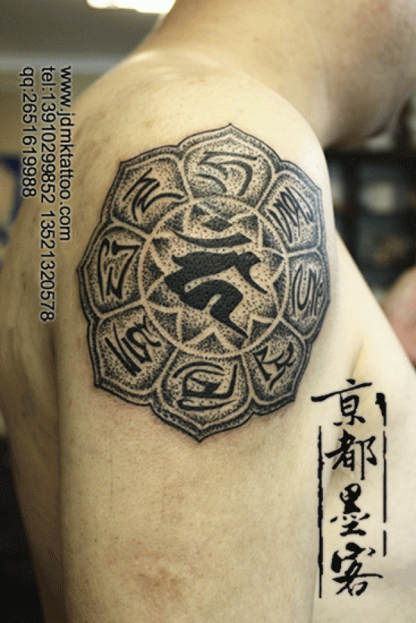 大臂生死有命富贵在天藏文黑白点刺纹身