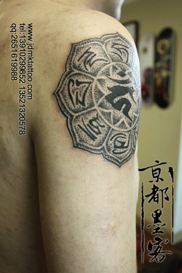 大臂生死有命富贵在天藏文黑白点刺纹身