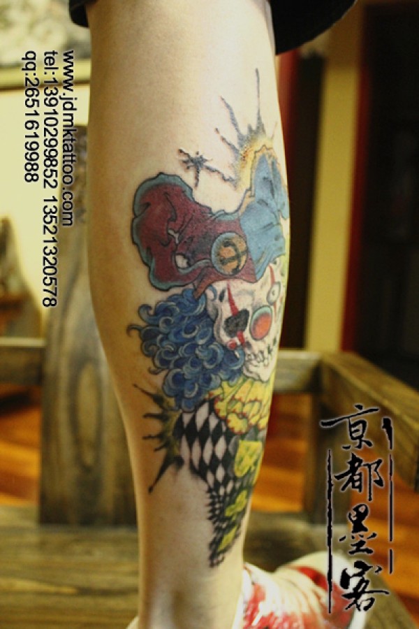 京都墨客纹身作品 小腿外侧小丑彩色纹身
