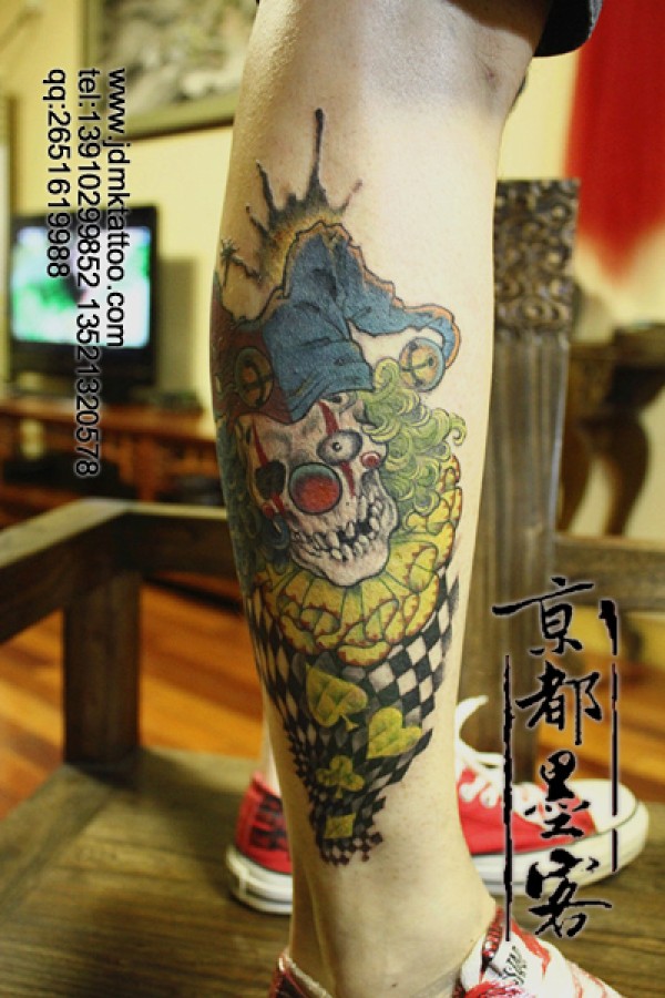 京都墨客纹身作品 小腿外侧小丑彩色纹身