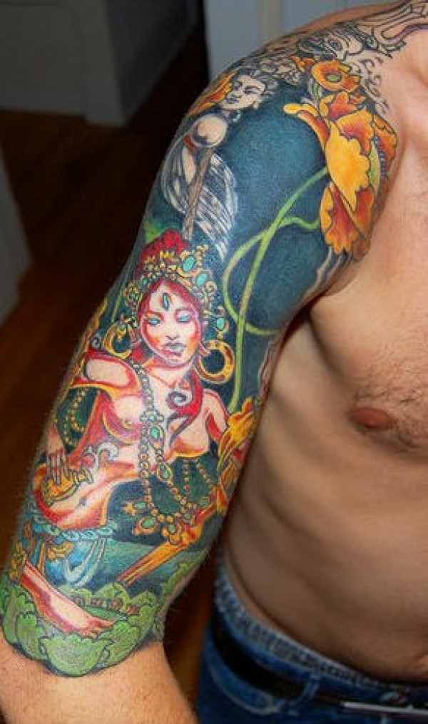 手臂佛教神像和花朵纹身图案