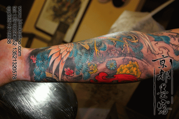 京都墨客纹身作品 包小臂中国传统仙鹤彩色纹身