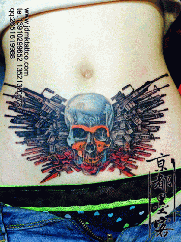 京都墨客纹身作品 腹部女生骷髅机械彩色纹身