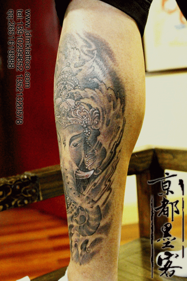 京都墨客纹身作品 小腿外侧象神黑白纹身