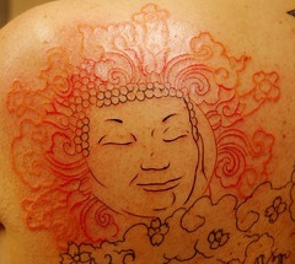 背部红色线条佛像纹身图案
