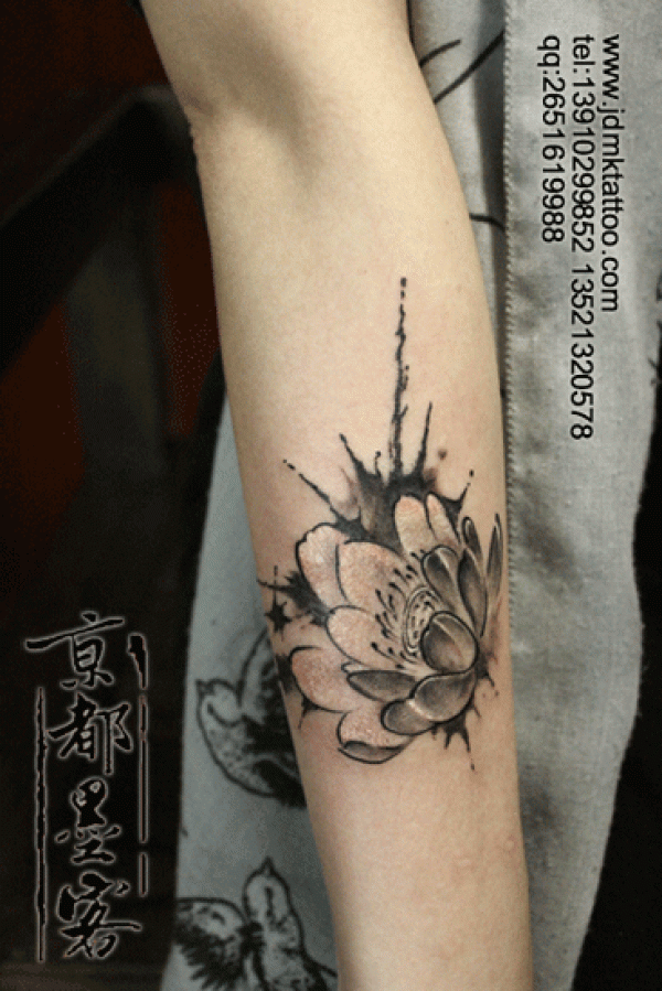京都墨客纹身作品 水墨荷花手臂烟疤遮盖纹身