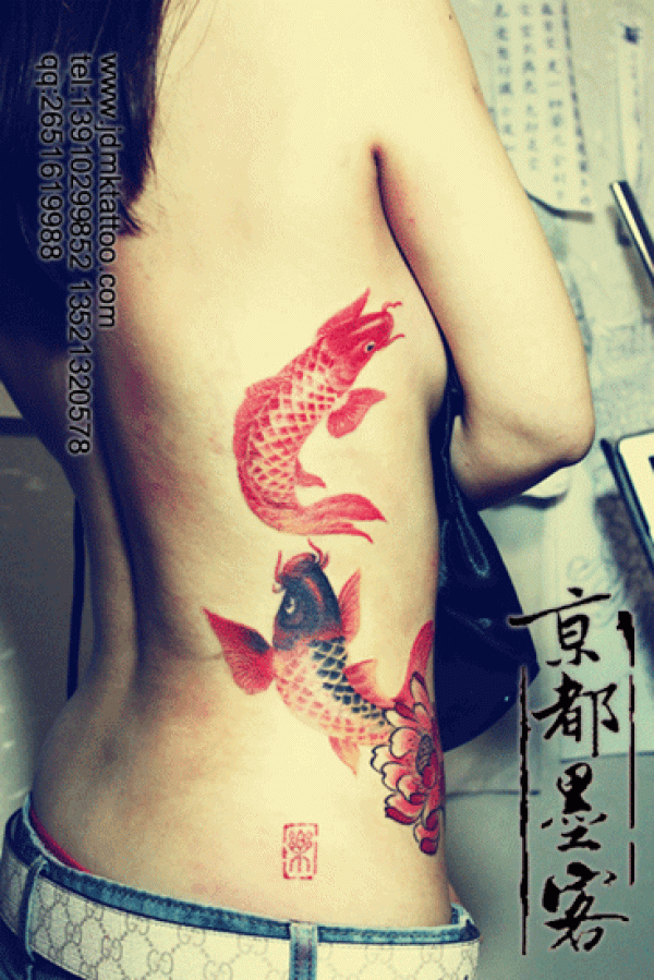京都墨客纹身作品 侧腰双鱼荷花纹身