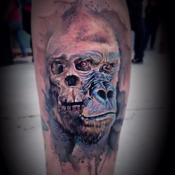 彩色大猩猩与骷髅腿部纹身图案