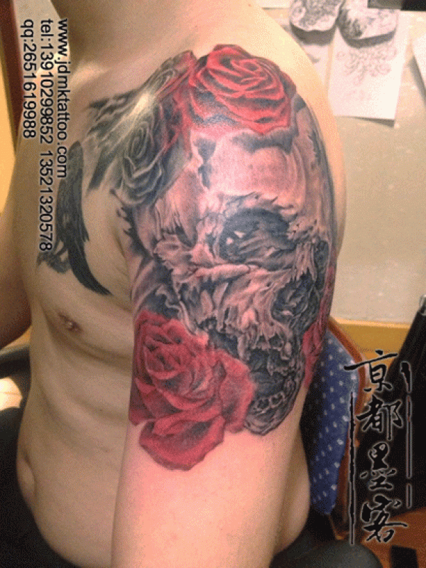 京都墨客纹身作品 半甲乌鸦骷髅头玫瑰花纹身