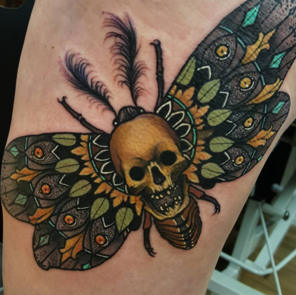 漂亮的彩色幻想骷髅与翅膀纹身图案