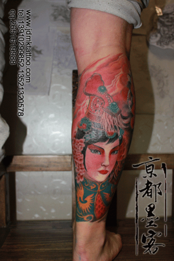 京都墨客纹身作品 霸王别姬彩色包小腿纹身