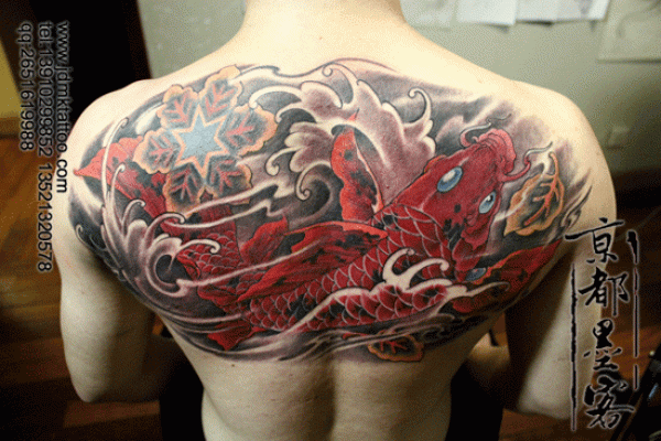 京都墨客纹身作品 大背锦鲤金叶雪花修改纹身