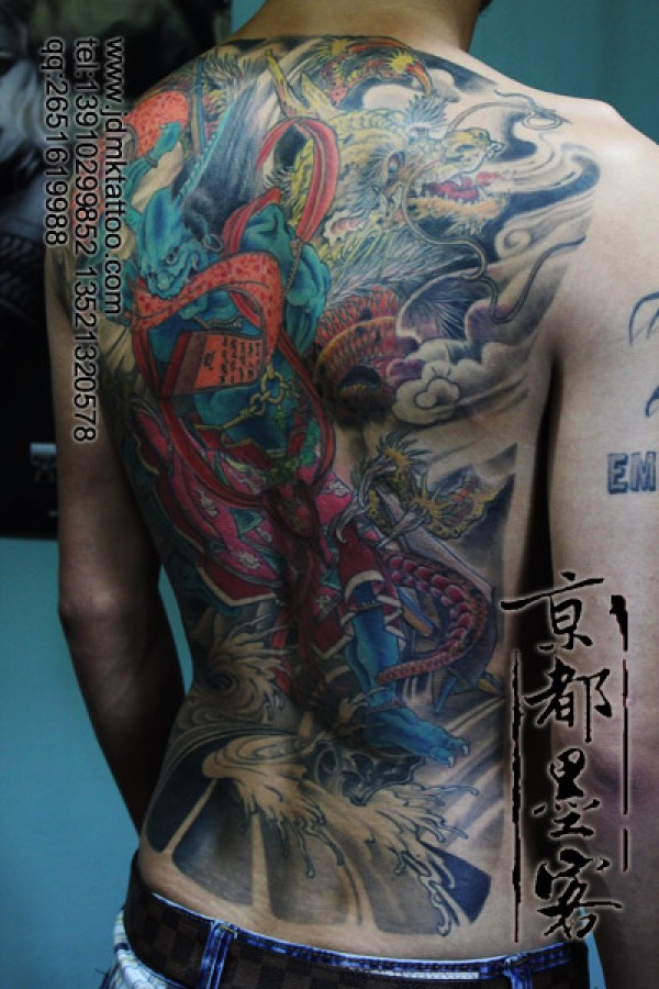 满背日式传统小鬼撕天书重彩纹身