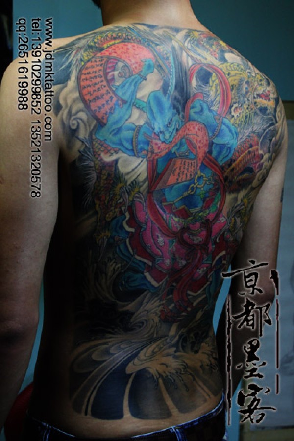 满背日式传统小鬼撕天书重彩纹身