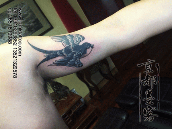 京都墨客纹身作品 燕子遮盖字母修改纹身