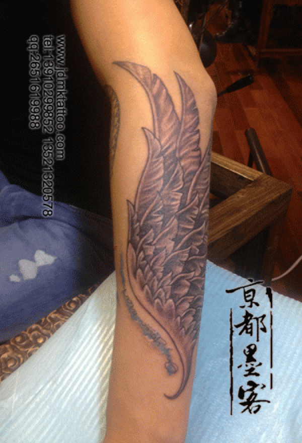 京都墨客纹身作品 男士小臂翅膀黑白纹身