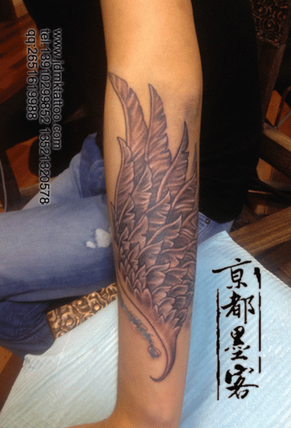 京都墨客纹身作品 男士小臂翅膀黑白纹身