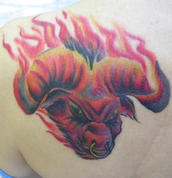 恶魔的公牛和火焰彩色纹身图案