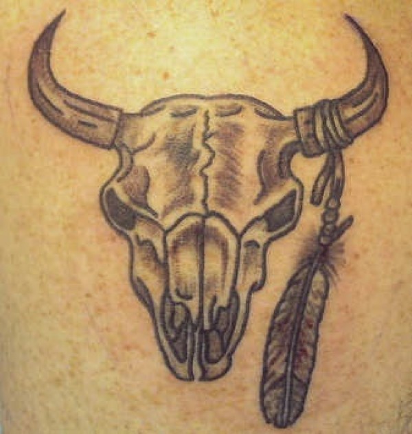 带有羽毛的公牛头骨纹身图案