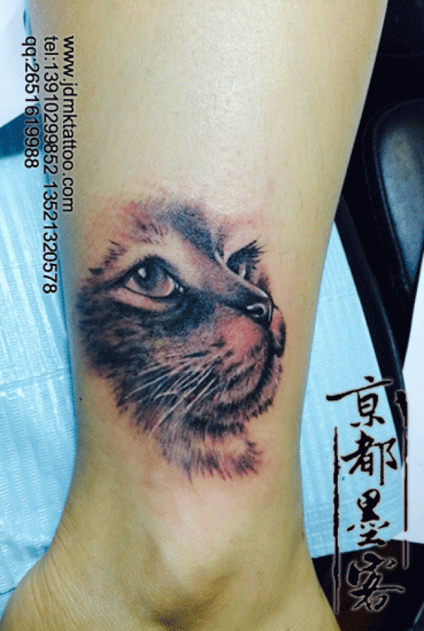 京都墨客纹身作品 脚踝猫写实黑白纹身