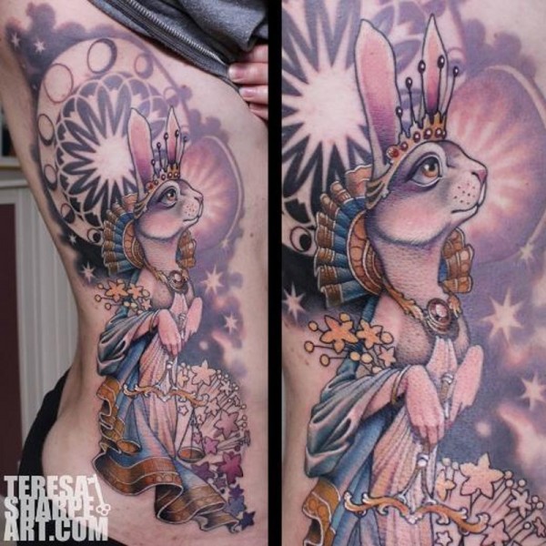 侧肋卡通彩绘可爱的兔子公主纹身图案