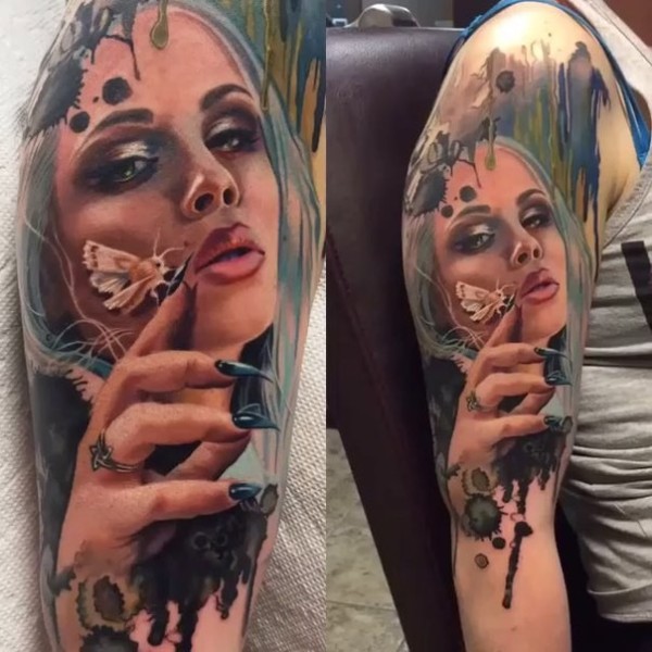 大臂逼真的彩色女人肖像与蝴蝶纹身图案