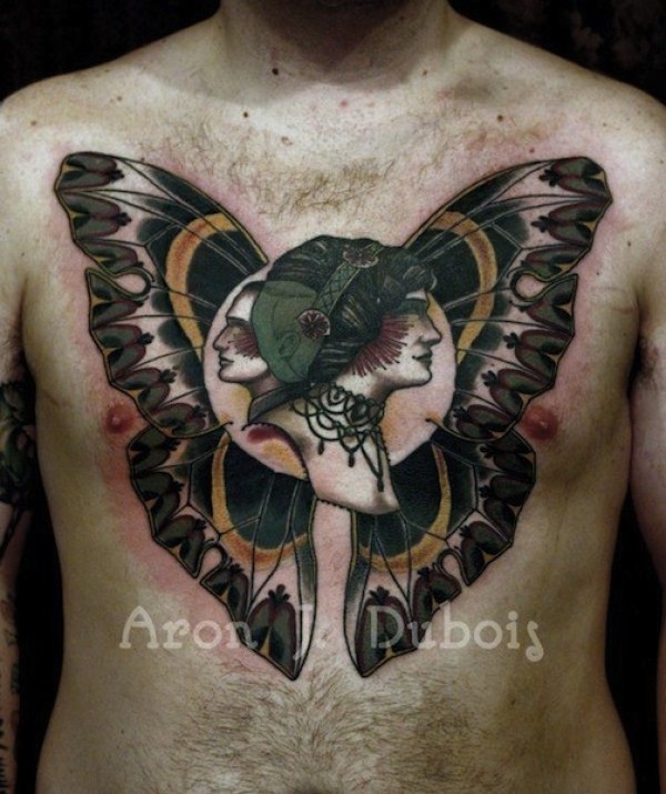 胸部彩色女人和男人肖像与蝴蝶翅膀纹身图案