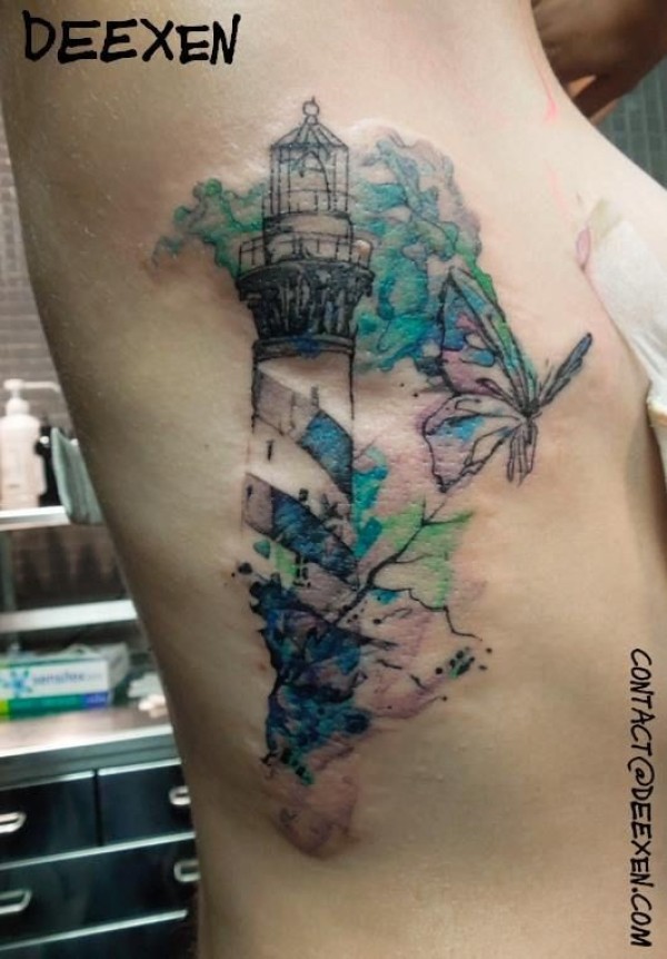 侧肋水彩风格彩色灯塔与蝴蝶纹身图案