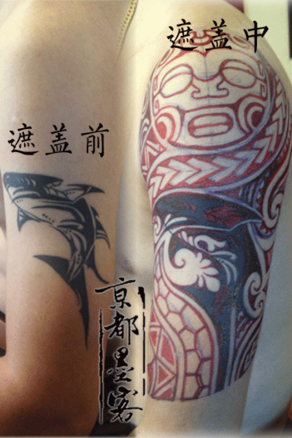 京都墨客纹身作品 大臂图腾遮盖海豚黑白纹身