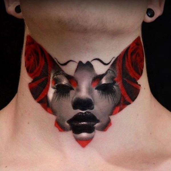 颈部令人印象深刻的蝴蝶与女性肖像纹身图案
