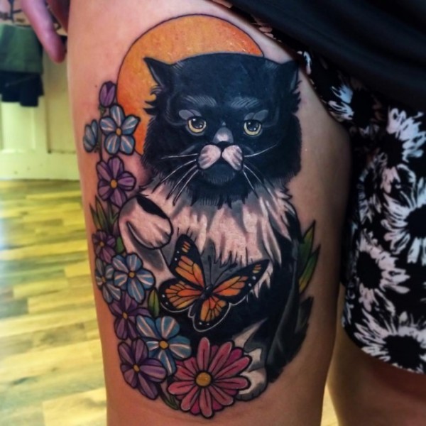 插画风格彩色大腿猫与花朵和蝴蝶大腿纹身图案