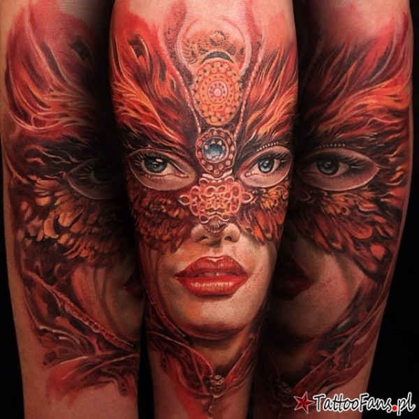 戴着蝴蝶面具的女性肖像彩色纹身图案